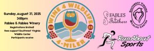 ***Postponed Until Spring 2026*** Wine for Wildlife 4-Miler – Enjoy the beauty of Fables and Feathers vineyards while logging some miles with friends and supporting the furry friends at Southwest Virginia Wildlife Center! This beginner-friendly four-mile route winds in and around the vines and property at Fables and Feathers, and the epic finish line of sipping and socializing awaits you! This event is not timed- rather it is a celebration of fitness, local scenery, socializing, and of course raising money for an amazing cause. Participants are welcome to time themselves along the route, but the focus is FUN, not competition.