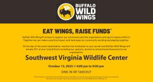 Buffalo Wild Wings Fundraiser – It’s going to be a great night if you’ve got case of the Mondays! For one day only from 4 p.m. to 9 p.m., 15% of your bill (less alcohol) will be donated to our cause (dine in or take out). Come out to Buffalo Wild Wings on Starkey to have a great meal, see some of our wildlife ambassadors, and watch 2 different Monday Night Football games (Chicago @ Minnesota and Atlanta @ Las Vegas)! Just show a physical or digital ticket, like the yellow and black one here, to your server and make a difference for wildlife!