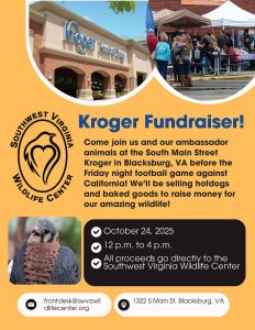 Kroger Fundraiser in Blacksburg, VA – Get game-day ready with us at the South Main Street Kroger in Blacksburg, VA before the big Friday night matchup against California! Meet our amazing wildlife ambassador animals, grab a hot dog or some delicious baked goods, and support your local wildlife hospital—all before kickoff!