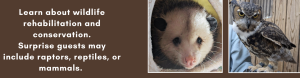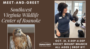 Rocky Mount, VA Library Educational Program with Ambassador Meet and Greet – Learn about wildlife rehabilitation and conservation and enjoy a visit from some of our formerly wild education ambassadors. Surprise guests may include raptors, reptiles, or mammals. No registration needed, this is a free public event available to all ages!