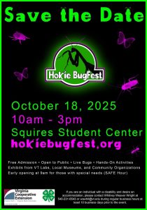 Hokie BugFest – We’ll be at Squires Student Center at Virginia Tech to participate in BugFest with a few of our education ambassadors. We plan to discuss the vital role bugs play in our ecosystems and how they are also sources of food for much of our native wildlife. Did you know that without healthy insect populations ecosystems would collapse? Hokie BugFest celebrates the fun and exciting science of entomology, and the Virginia Tech tradition of learning and discovery, through outreach and engagement. This event highlights an ongoing youth education program hosted by the Virginia Tech Department of Entomology, Virginia Tech College of Agriculture & Life Sciences, Virginia Cooperative Extension’s 4-H program, and the department’s student-run professional organization, the W. B. Alwood Entomological Society.